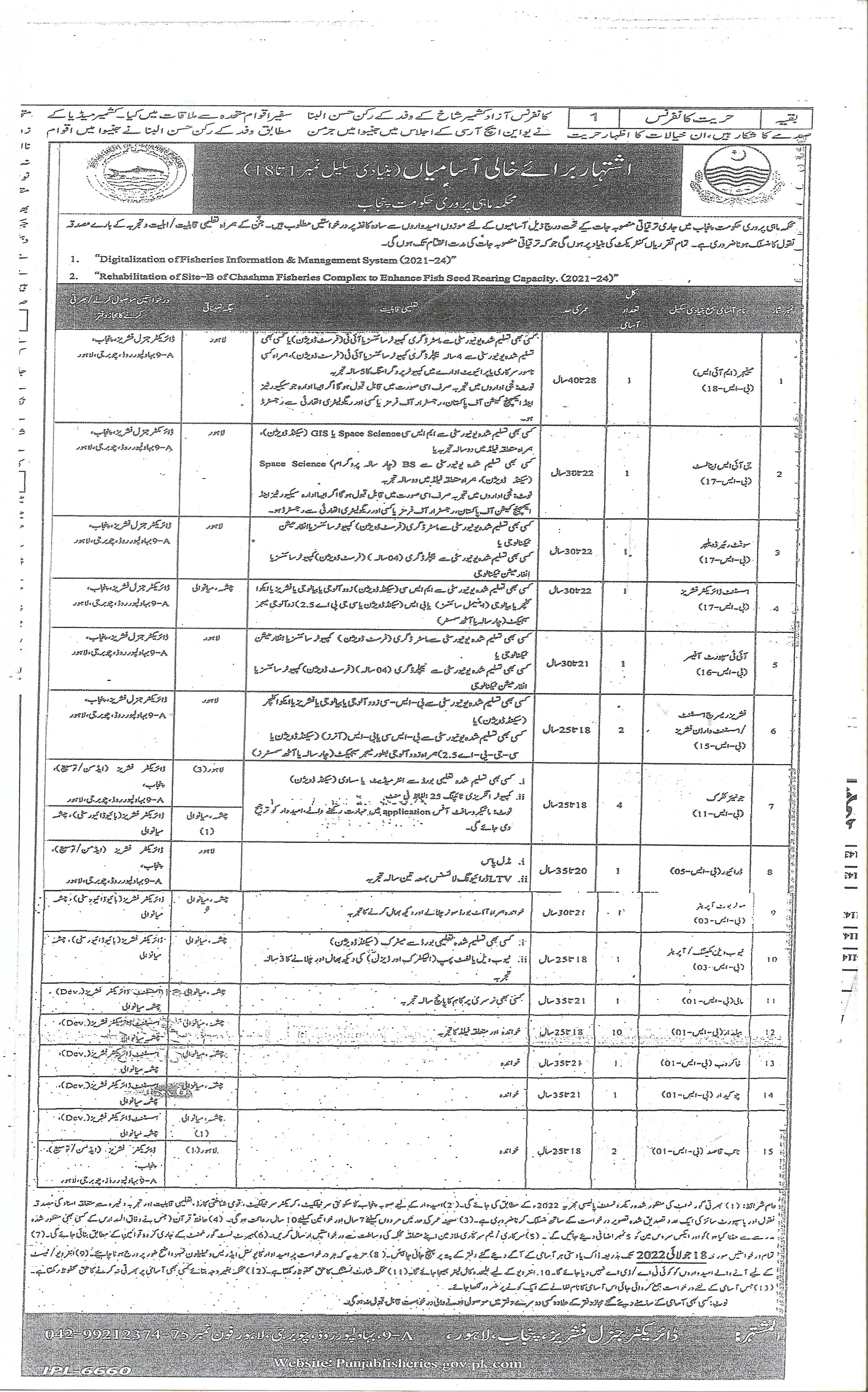 Assistant Director Fisheries, Research Assistant, GIS Analyst, Chowkidar, Naib Qasid, IT Support Officer, Tube Well Mechanic, Khakrob, Manager MIS, Clerk, Software Developer, Solar Kat Operator, UDC, and Tube Well Operator.